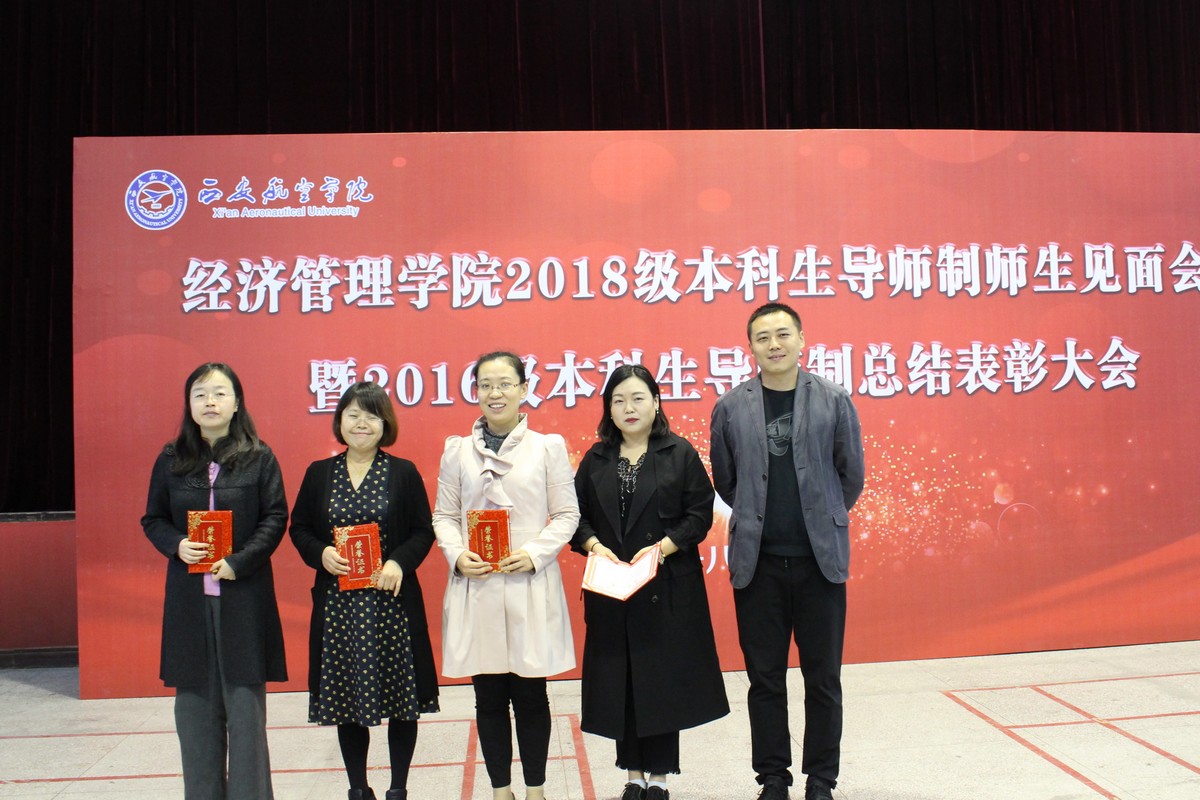 李波宣读了西航经管字【2018】5号《best365网页版登录关于授予潘媛等教师“本科生导师制优秀指导教师”称号的决定》对获得“优秀本科生导师”称号的潘媛、吴玥弢、王蓓、李海绒、陈军五位老师表示祝贺并为其颁发荣誉证书。