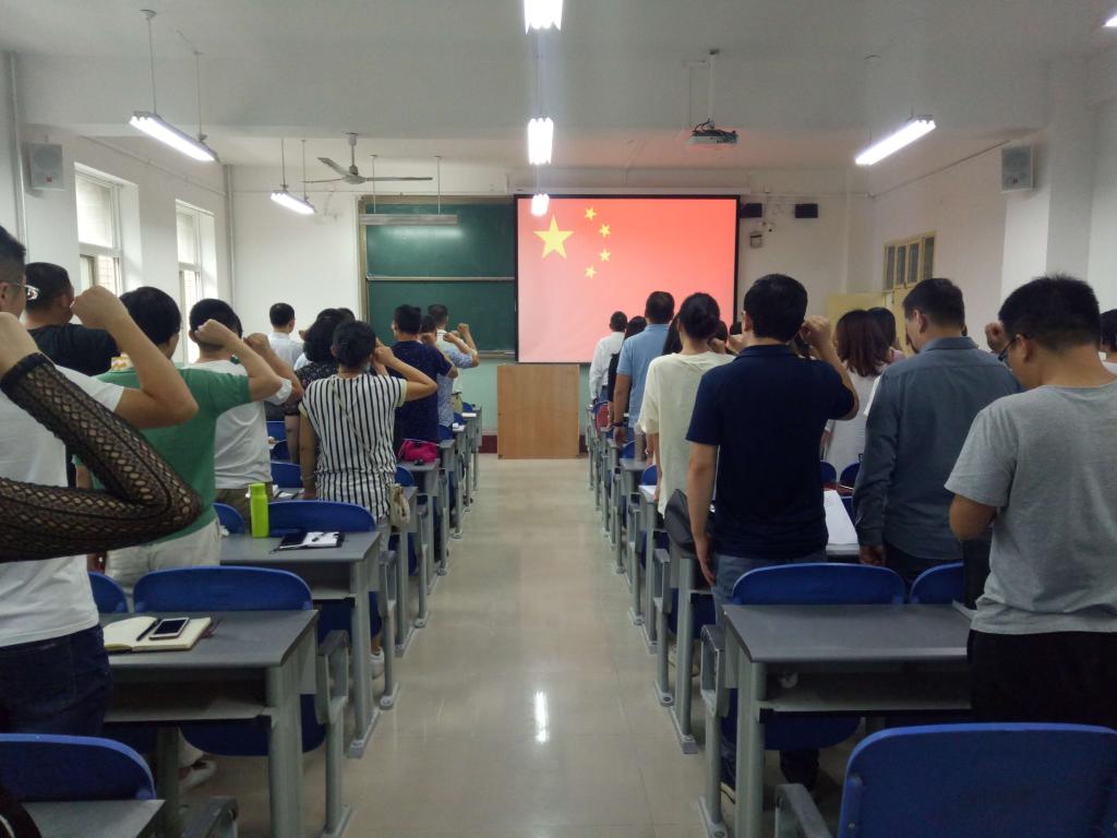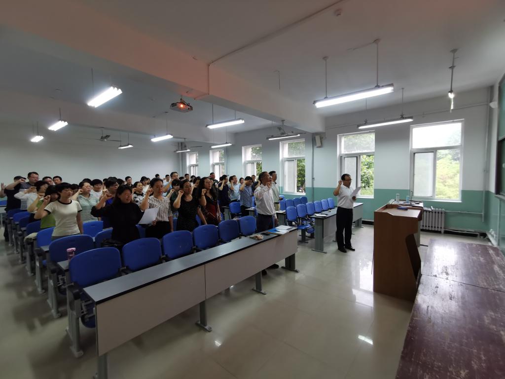 院长史亚洲带领全体教师面向国旗,庄严宣誓。老师们立志做有理想信念、有道德情操、有扎实学识、有仁爱之心的好老师。
