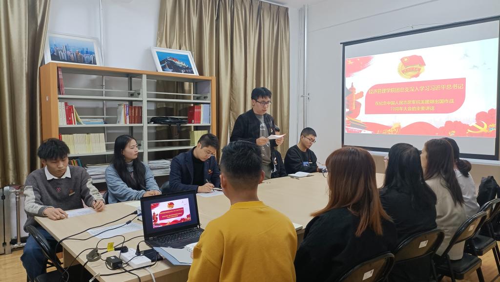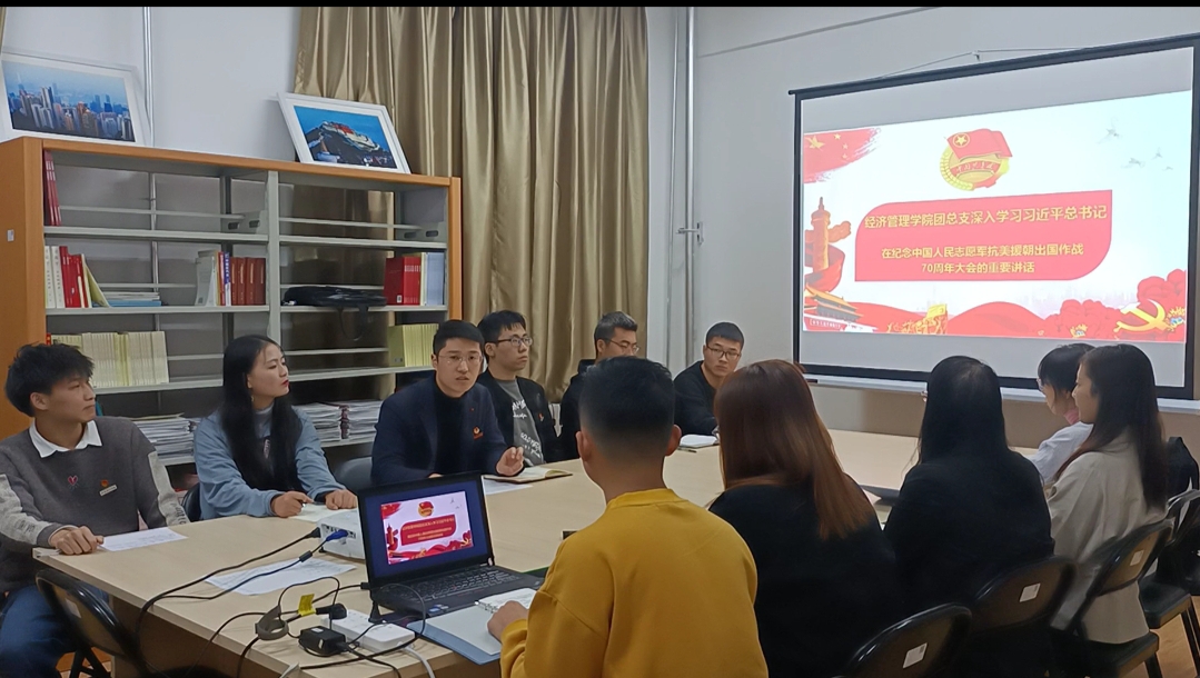 全体团学干部在团总支书记王宏超老师的带领下,共同观看、学习了习近平总书记在纪念中国best365网页版登录人民志愿军抗美援朝出国作战70周年大会的重要讲话视频。随后,又共同观看了《致敬抗美援朝》短视频,一同聆听了《中国best365网页版登录人民志愿军战歌》,志愿军英勇战斗的画面和激昂的战歌,再次点燃了在座每一位同学的爱国热情。团总支秘书李若瑾、团总支秘书辛菲、志愿者中队队长祁旭斌、学生会副主席张智睿、宣传部副部长项子轶相继发言并分享了学习心得。