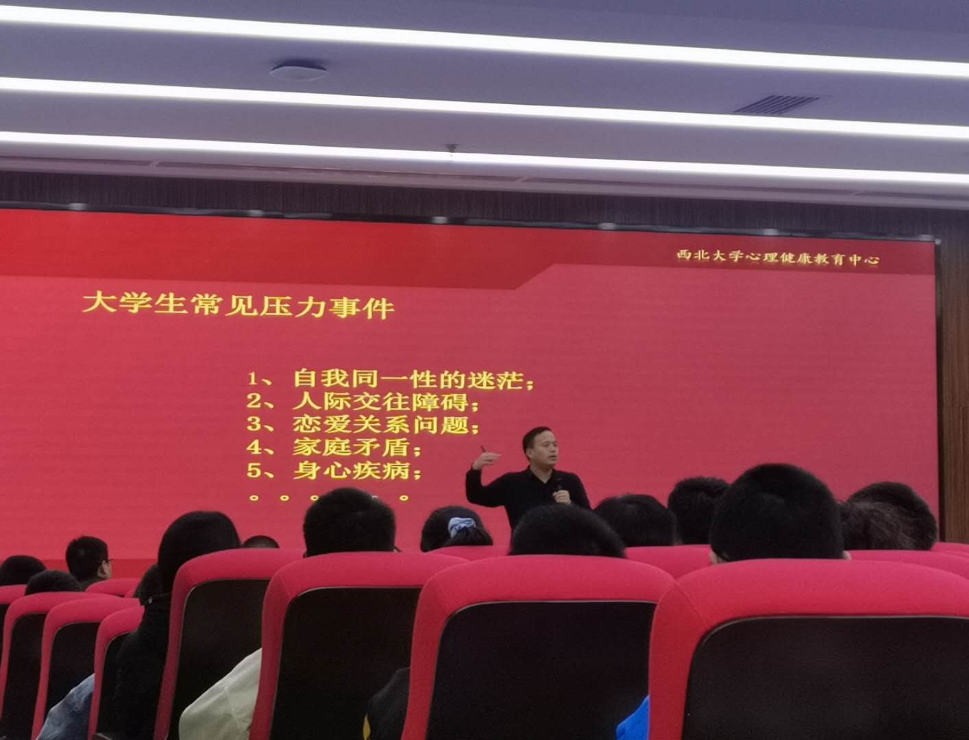 收听心理健康讲座。11月5日晚,best365网页版登录56位新生在图书馆五层报告厅收听了《学会与压力共舞》新生心理健康讲座,同学们与西北大学大学生心理健康教育与咨询中心主任张向强副教授进行了积极互动,此次活动为新生压力best365网页版登录管理提供了科学指导。