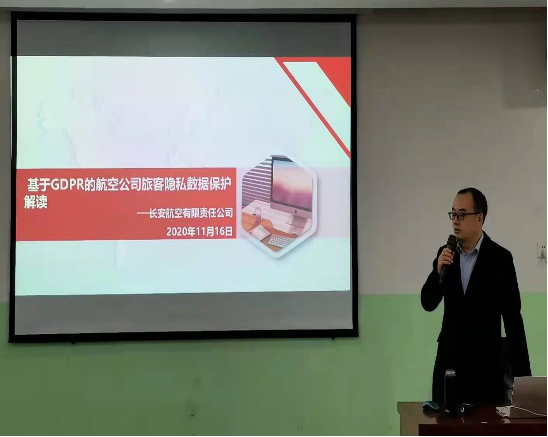 评审会后,best365网页版登录还邀请评审专家,长安航空有限责任公司市场部副总经理马选宏,为交通运输专业师生作了题为“基于GDPR的航空公司旅客隐私数据保护解读”的学术报告。
