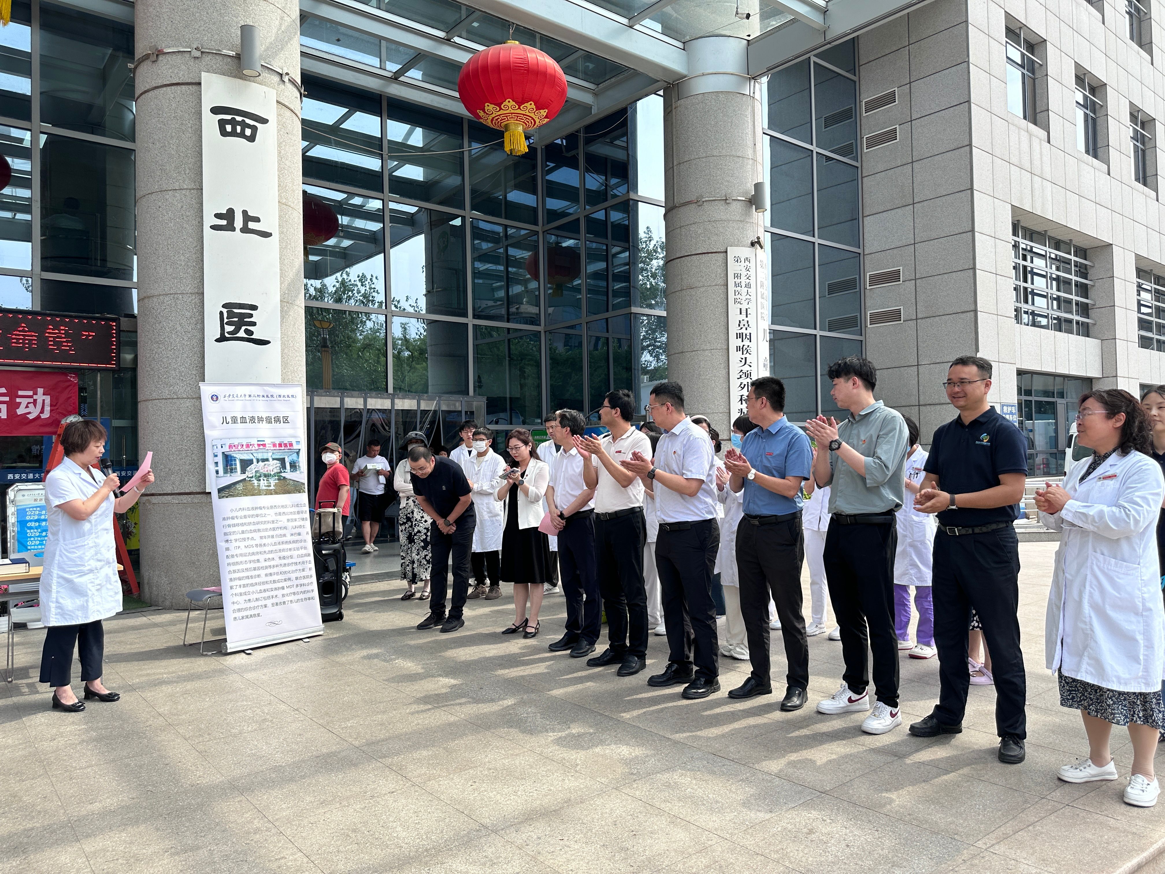 本次活动启动仪式在交大二附院综合门诊大楼广场开展,由交大二附院儿科主任杨琳主持,西安交通大学第二附属医院党委副书记、纪委书记滕文葆、团委书记董艳、血液科主任赵万红、血液科张鹏宇教授、儿科肖延风教授、团委副书记鲍和,以及北京同心圆基金会西北地区负责人、西安市心羽志愿服务中心项目总监赵孟虎,best365网页版登录党总支书记张鹏、校团委副书记米嘉琪、best365网页版登录学生best365网页版登录管理科杜航宇、best365网页版登录团总支书记李金泽及儿科、血液内科医护人员、医学生、我院学生志愿者等50余人参加活动。