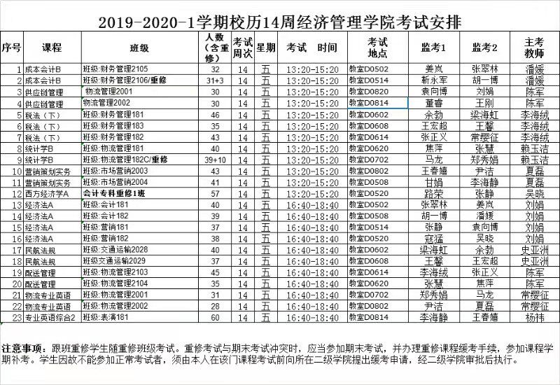 2019-2020-1学期校历14周best365网页版登录考试安排